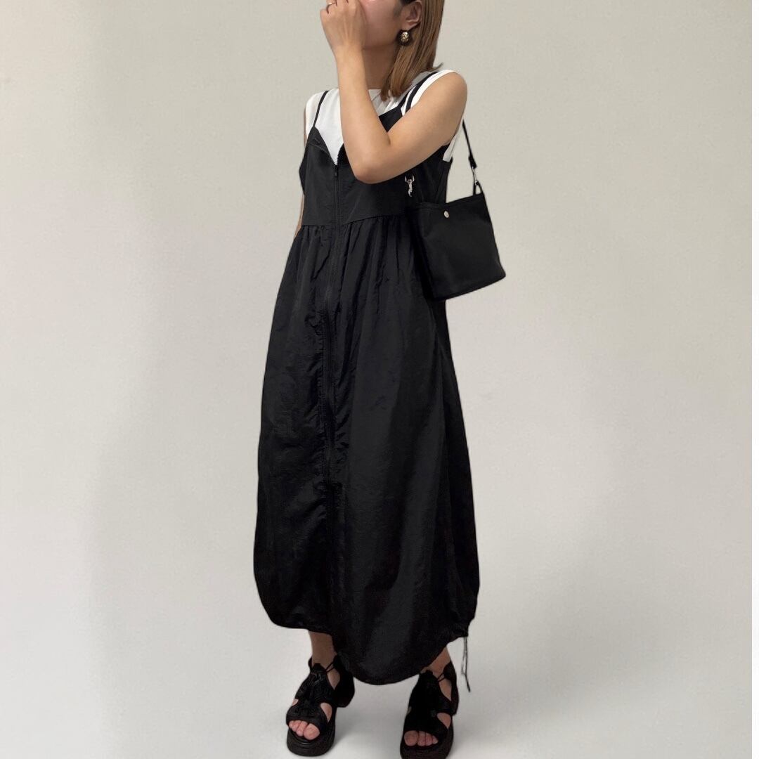 軽やかなナイロン素材とシルエットチェンジが楽しめるデザインのキャミワンピース。