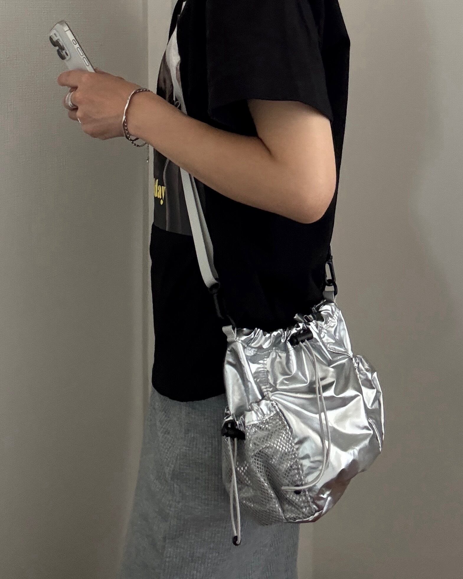 ツヤ感のあるシルバー素材と、くしゅっと感が可愛い巾着デザインで、持つだけでこなれた雰囲気になるショルダーバッグ♪