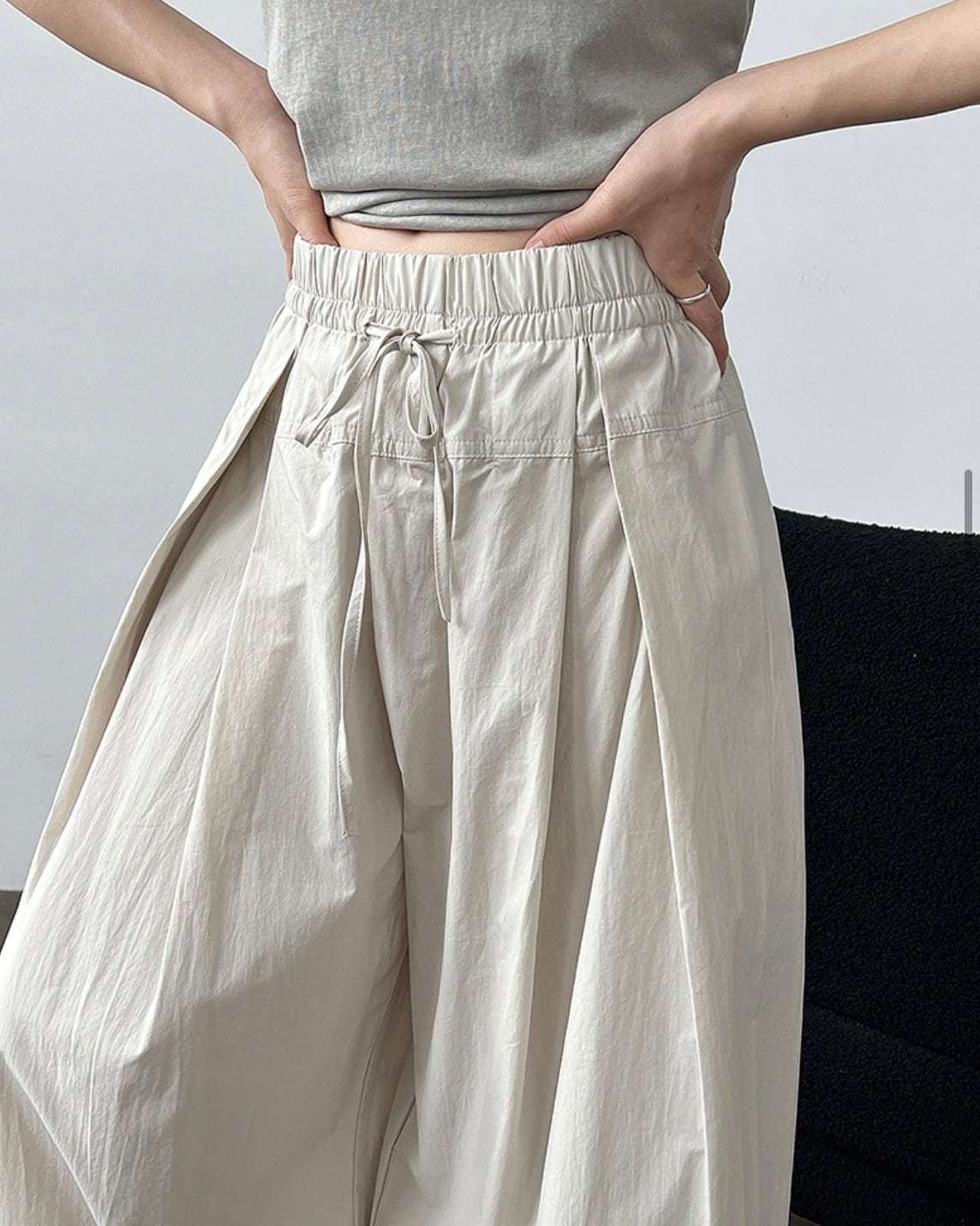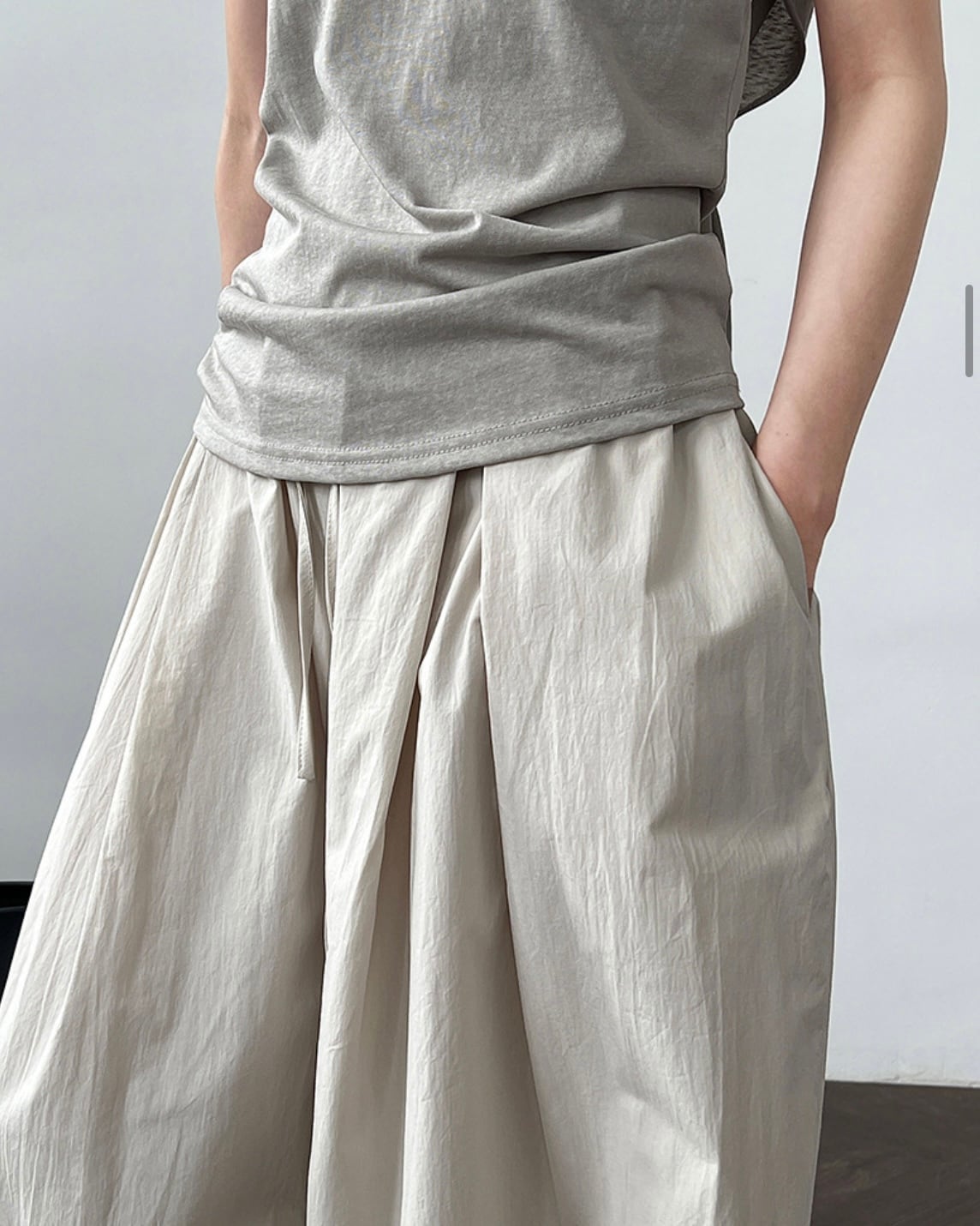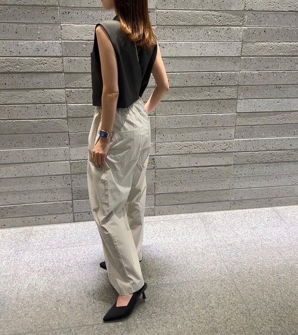 ウエスト部分はドローコード仕様でサイズ調整が可能。フロントに入ったタックが立体感を生み、動くたびにきれいな落ち感を演出します。