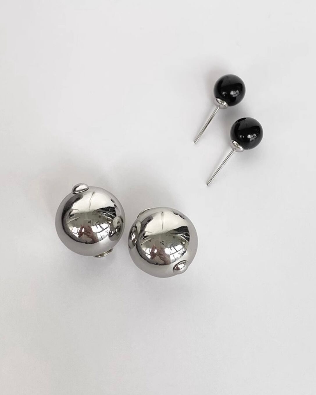 バイカラーの大小メタルボールデザインのピアス。