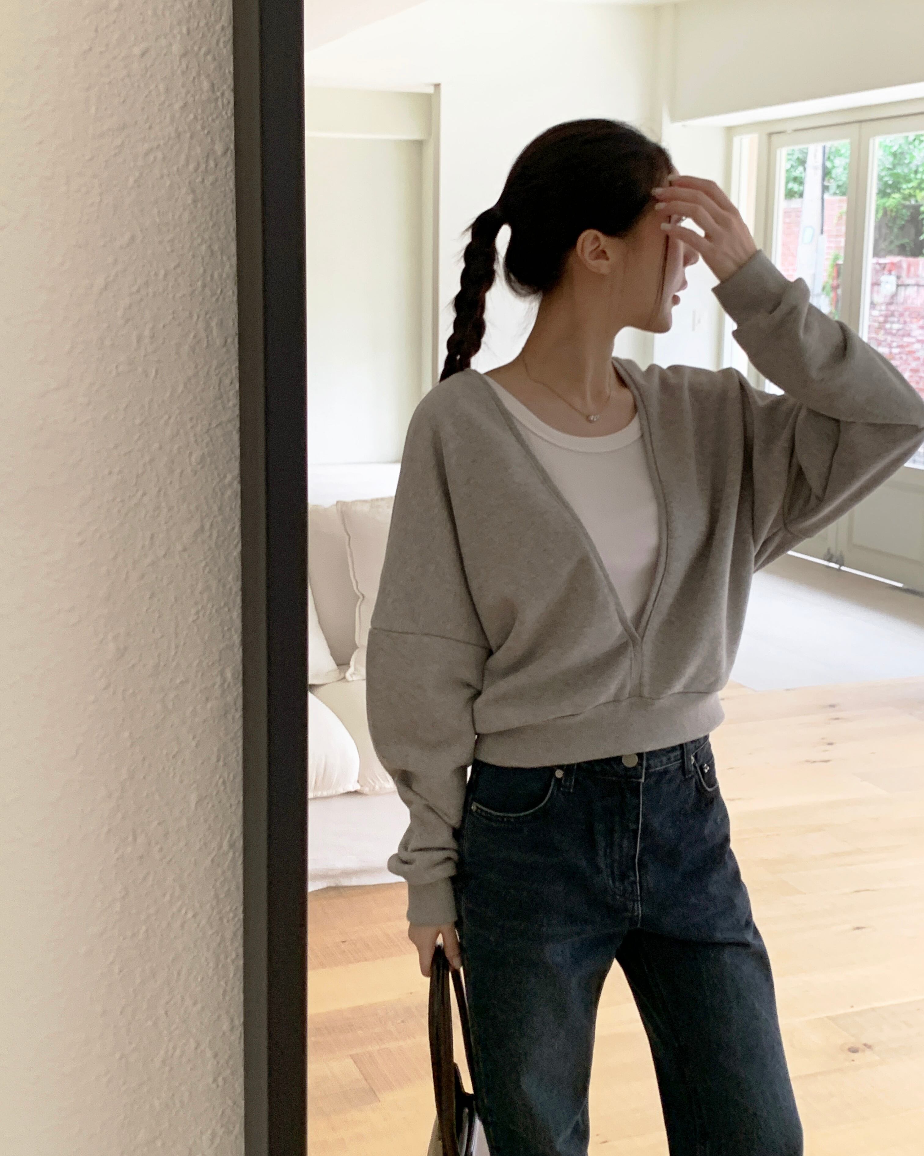 ゆったりとしたシルエットのスウェットは、顔まわりをすっきり見せてくれるデザインです。