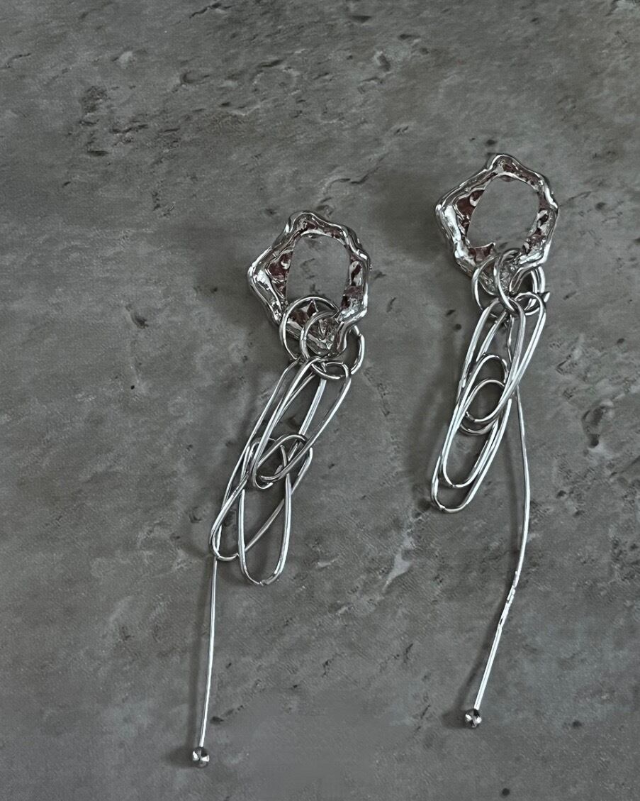 立体感のあるメタルモチーフとランダムに重なり合うワイヤーラインが存在感を放つアートライクなイヤリング。